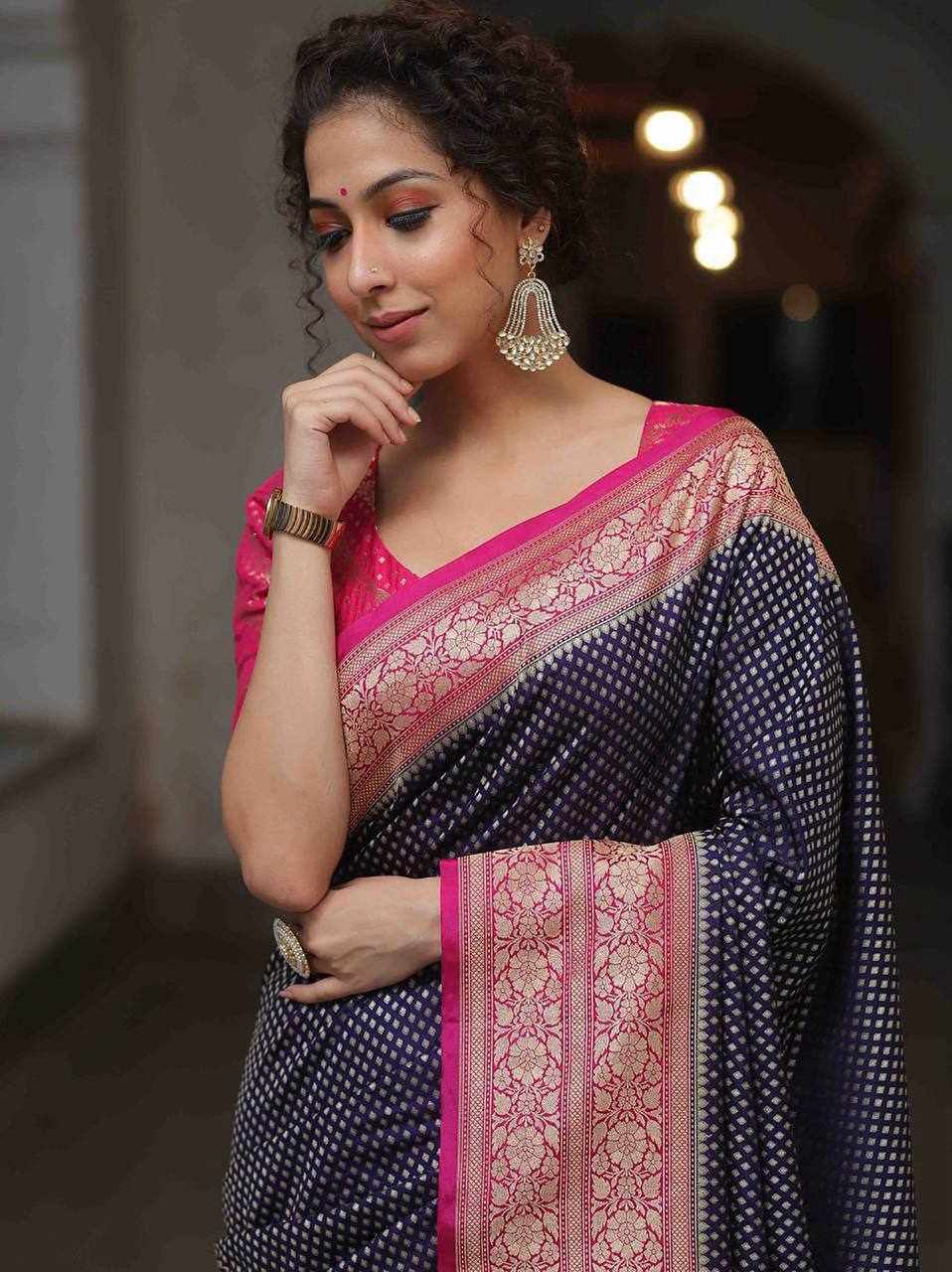 Design: Beautiful rich pallu with intricate jacquard work woven all over the saree, offering a graceful and luxurious look
