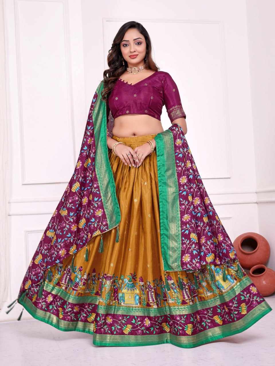 | Name : | PIYU 10-2 Silk Chaniya Choli With Viving Foil Yellow Lehnga |
